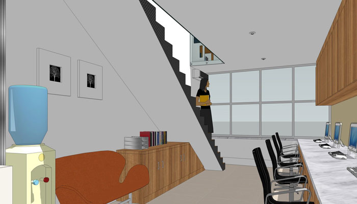 進門區(qū)域的設(shè)計:由于建筑本身的面積限制,設(shè)計師在設(shè)計的時候?qū)⑦M門區(qū)域直接設(shè)計為接待空間,一則利用建筑本身的特點為客企業(yè)打造舒適、放松的接待空間,二則對空間進行合理的劃分。