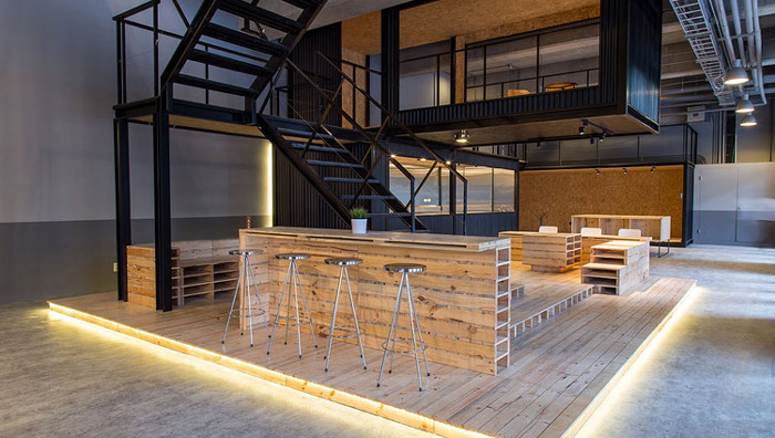LOFT風格辦公室接待區設計:木材構成的接待區與吧臺,打造了客戶進入空間后看到的第一個區域,木材讓人感到親切,格局的整齊讓客戶感受到企業的嚴謹,設計師需要的就是在親切與嚴謹之間尋求一種心態上的平衡。