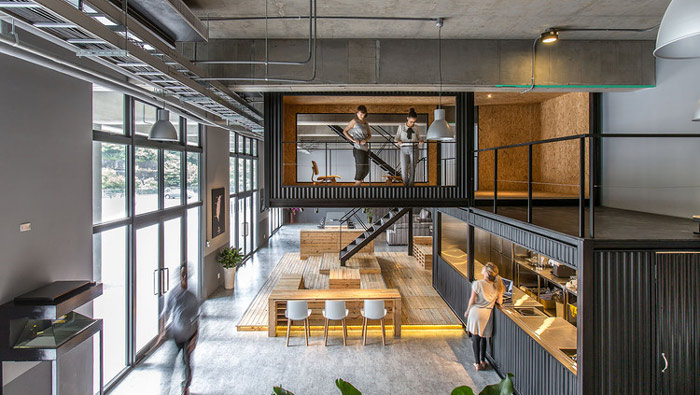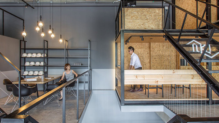 LOFT風格辦公室辦公區設計:二樓被設計師分為左右兩邊,且兩邊沒有任何交集,中間被幾十公分的空隙隔離,設計師希望讓相互之間產生一絲距離,正所謂距離產生美,彼此之間留有一點點距離也是挺美好的。