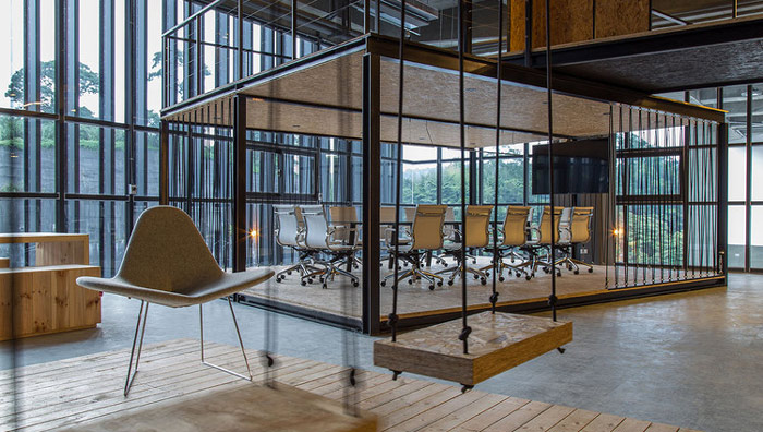 LOFT風格辦公室會議室設計:會議室位于一樓的邊緣,在這里不會占用空間的主流空間,同時此處也十分安靜,十分適合會議的開展,四面透風也讓會議室少了很多束縛,讓員工在會議中可以暢所欲言。