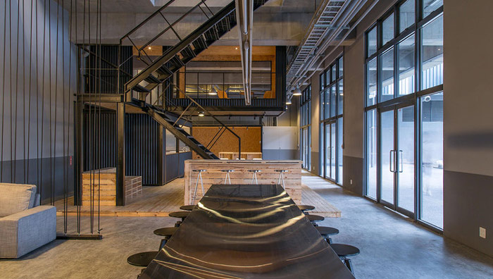 LOFT風格辦公室大廳設計:在辦公室一樓設計中,設計師基本上采用的都是輔助性設計,例如接待區、吧臺區、休息區,樓梯曲折向上讓人對上部空間產生好奇,一樓的設計也為企業接待客戶提供各種可能。