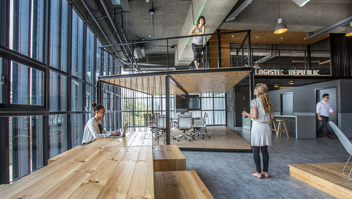 LOFT風格辦公室進門區設計:物流公司的業務主要就是取與送,所以在先天上就會十分在意路線的構建,整個空間也同樣如此,設計師通過上下結構的錯差,讓空間在錯落之間尋求一種平衡。