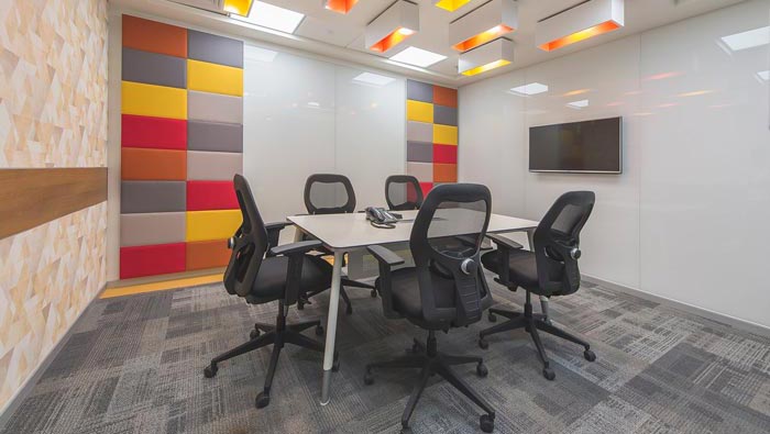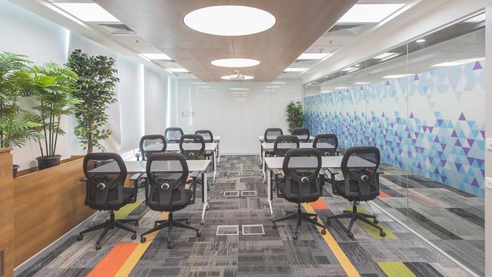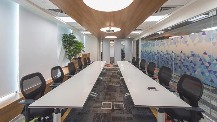 匯報區域的設計:設計師在設計的時候,將其設計為類似教室的布局,在設計師看來教室是講學與求教的雙重融合布局,這樣的布局在此處被完美嵌入,企業與客戶就相當于兩個不同的群體,一方為要求者、一方為解決著,這樣的布局利于雙方之間的彼此互動。
