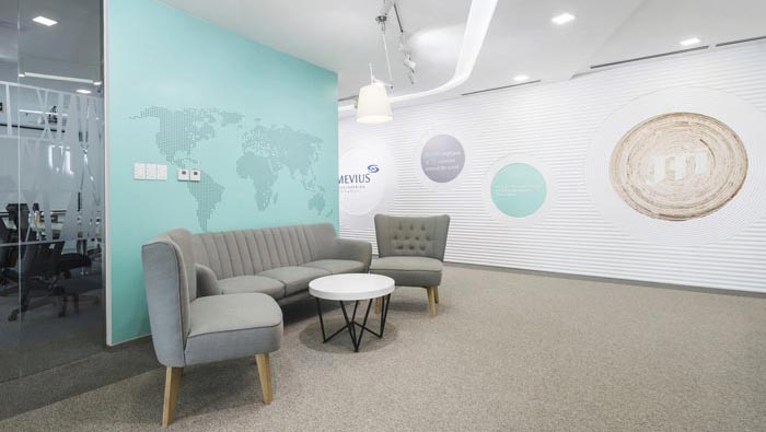 進門區域的設計:設計師在實地考察之后發現此處不適合設置前臺,因為進門處是一個空曠到區域,若是設置前臺會造成空間的阻隔,在風水上對企業不好,故此設計師對此處進行了多次的推演與重組,最后選定一種模式,就是用隔斷隔出一個接待區域出來,在接待區域的前方利用軟裝與logo墻的搭配,完成企業的品牌展現。