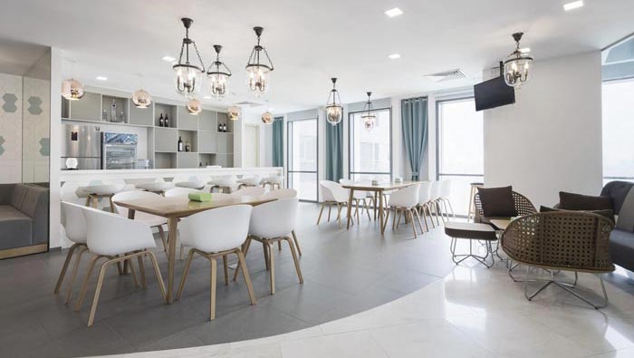 茶水間的設計:此處位于一個開放的空間之中,在設計中設計師將茶水間安置在空間的一側,這樣設計的目的就是釋放更多的空間,為茶水間的輔助功能讓位,輔助功能就是休息場所、交流場所,設計師這樣做的目的就是希望將空間發揮到最大化,讓員工有更多減壓的場所。