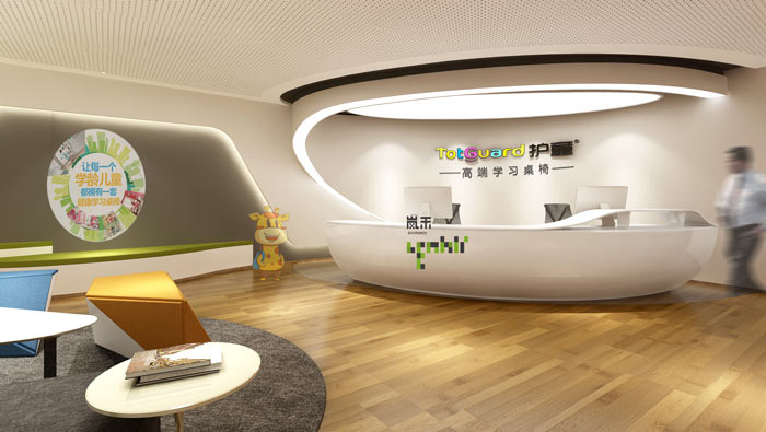 科技公司辦公室前臺設計:護童——高端學習桌椅,設計師以文字的融合達到讓客戶,在第一時間了解企業的屬性,讓每一個學齡兒童都擁有一套健康的學習桌椅,代表了企業產品開發的核心。