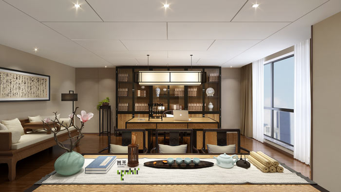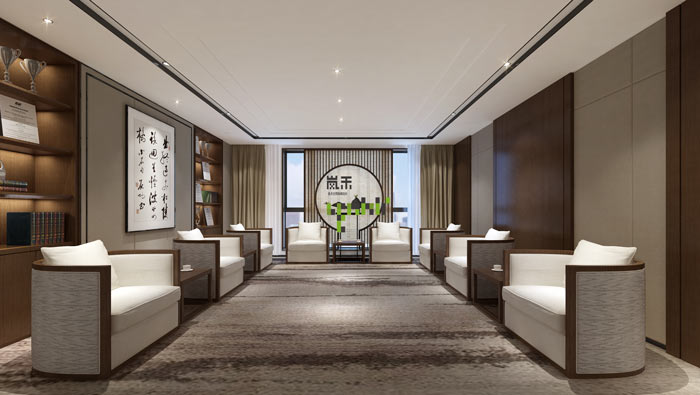 科技公司董事長辦公室設計:董事長在事業上面基本上達到了頂點,故此需要格外注重自己的德行,中式的設計主要表現在順應自然,設計師希望董事長可以在觀察自然中去修自己的德行。