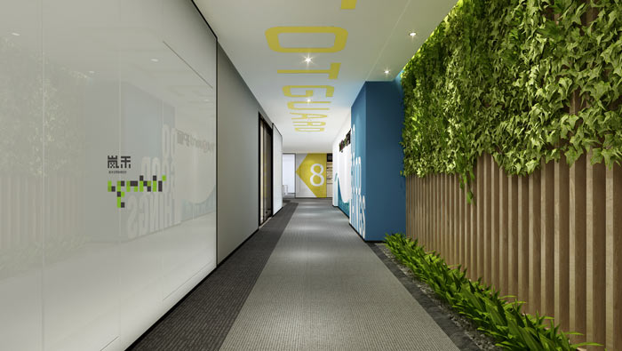 科技公司辦公室員工過道設計:公司一共有兩個門可以進入,這里通俗點說就是后門,員工通過這里進出空間,綠色、自然的設計,是設計師希望讓員工每天都有一個好心情。
