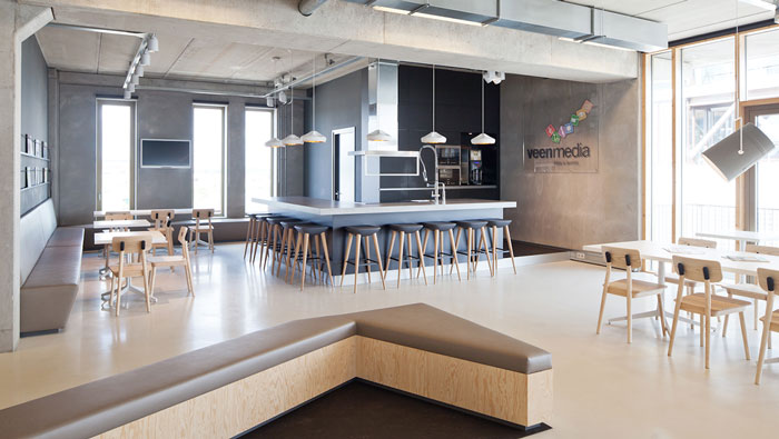 現代簡約辦公室吧臺設計:在設計中設計師采用的是全封閉的設計理念,將茶水間所有裸露在外部的設施安置在吧臺之內,目的就是屏蔽所有一切的不和諧,讓空間在整體上更加的自然、簡潔,此處休息、接待、洽談、交流、學習應有盡有,空間的融合度極高也提高了辦事效率。