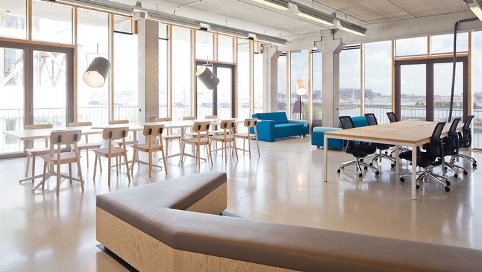 現代簡約辦公室休息區設計:此處在辦公區域的后方,三面都是落地窗,陽光透過窗戶射入空間,給空間一種懶洋洋的感覺,此處極適合休養生息,在設計師的想法當中,在快速發展的社會當中,對于人的感受缺少了極大的關懷,故此設計師希望在此處為員工打造一處關懷之地,讓員工放下心中的壓力,去體會那自然的景觀。