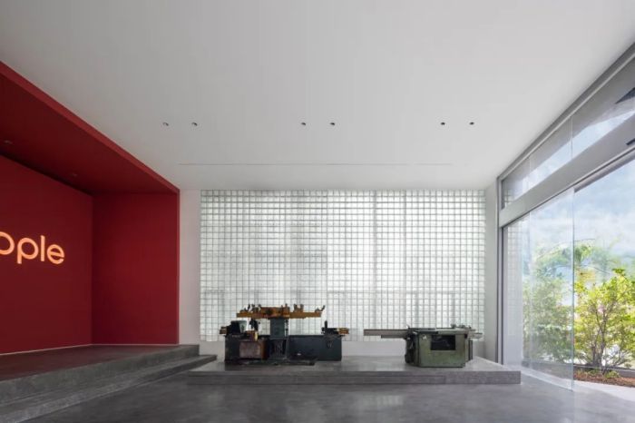 設計師注重建筑與環境的和諧共生,通過對原入口的功能優化、文化大廳的內部重塑、以及5F體驗館的創新設計,展現了紅蘋果品牌的文化傳承與未來愿景。其中,5F體驗館以其獨特的“空器合一”概念為核心,通過簡潔而有力的設計語言,傳達了人、空間與物品之間的和諧統一。