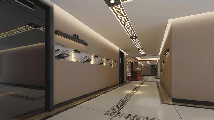 過道的設計:在過道的設計中,設計師堅持便捷的設計原則,設計師采用頂、地條紋相結合的方式,為客戶起到指引的作用,此處的設計原則十分明顯,就是便捷與導引,設計師希望在設計中融入導引的元素,讓客戶不至于迷路,同時導引線也會讓客戶感受到企業的細心與善意。