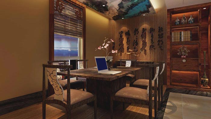洽談室的設計:此處位于過道的盡頭,此處與外界隔絕自成一體,設計師的目的就是通過前臺人員將客戶接待?此處,讓客戶在空間中感受到企業服務的理念,中式風格本身就會給人以家的感覺,在加上中式家具、墻畫、插畫的點綴,讓空間擁有更多自然的屬性,讓人在此處可以靜下心來感受空間的脈絡。