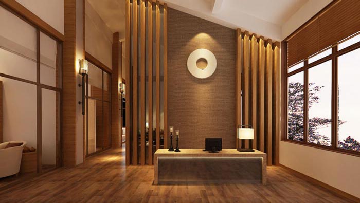前臺的設計:空間本身是一個下沿式的空間,設計師在思索許久之后,覺得首先是要消除空間下沿的缺憾,在此基礎上設計師以隔斷自然向上的布局,來沖淡空間的下沿格局,化不利為有利,在過道處采用一個超過90度的角度來完成空間的節點,這樣既化解了下沿式的格局,也塑造了大氣、溫馨的空間格局。