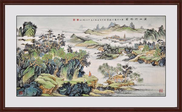 1:詩意山水,靜觀自得,此畫調用了山、水、云、樹、石、房,它們共同組成的山水情調、氣氛給畫面以籠罩和感染;