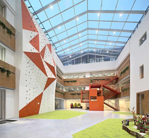 大廳的設計:設計師在設計的時候,保留了建筑本身的優點,攀巖的裝飾物給人一種勇于挑戰的動力,兩旁的草坪給人一種鳥語花香的世外氣息。