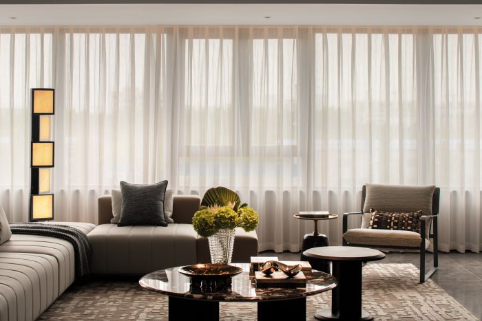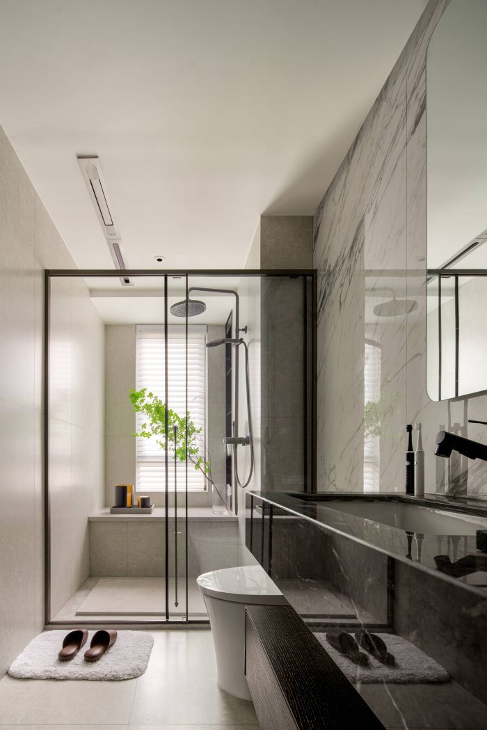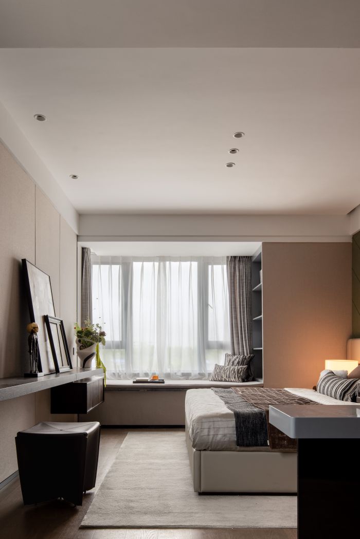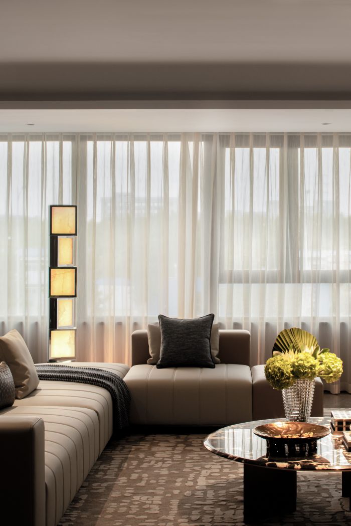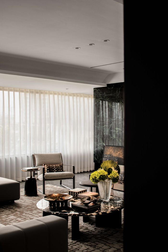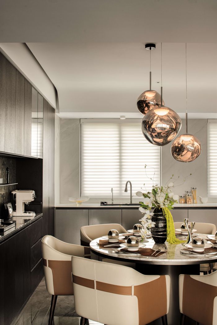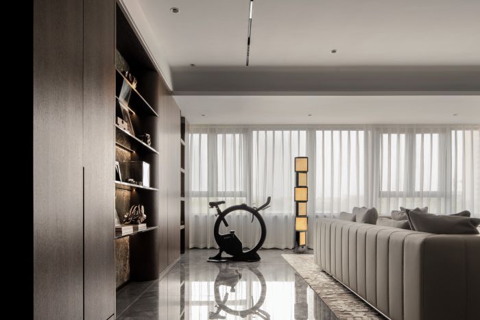 客餐廳整體風格現(xiàn)代輕奢,設(shè)計語言采用直線條為主,塊面的分割,給人以簡潔大方的感受。客廳空間整體方正且視野開闊,劃分為會客廳及有氧多功能區(qū)一體,自由且舒適,餐廳區(qū)域為開放式餐廳,中餐及西式操作臺結(jié)合,實現(xiàn)不同的功能需求。地面材質(zhì)公共區(qū)域大面積采用深灰色網(wǎng)紋石材鋪貼,大氣穩(wěn)重。