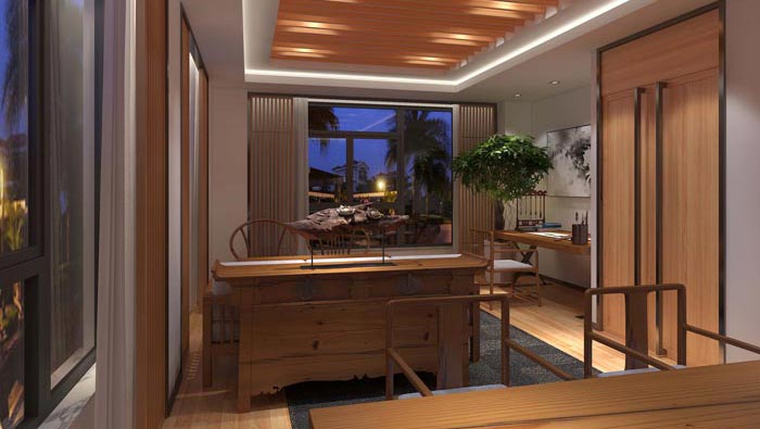 總經理辦公室的設計,設計師在設計的時候將其安置在接待區域與樓梯區域的中間方位,一來這樣的設計利用企業的工作需要,二來這樣的設計可以給總經理一個安靜的空間氛圍,加厚的門像是一道保險,將噪音與不理因素擋在門外,使此處自成一體。
