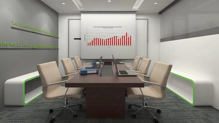 會議室的設計,設計師在設計的時候,將會議桌安置在中心區域,這樣在保證基本的需求之外,還可以使動線分布在兩端加大空間的活動空間,同時在不影響空間功能的前提下,設計師利用軟裝來增加空間的承載能力。