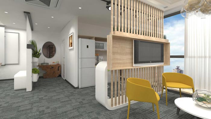 接待區域的設計,設計師在設計的時候,將其安置在靠近窗戶的區域,這樣的布置主要目的就是為了讓室外景色映入眼簾,讓客戶在等待的時候可以俯視整個城市的風景,在等待中欣賞,在欣賞中等待。