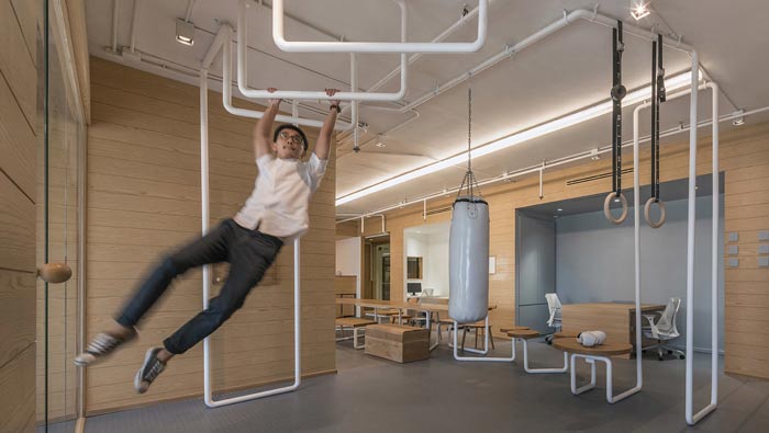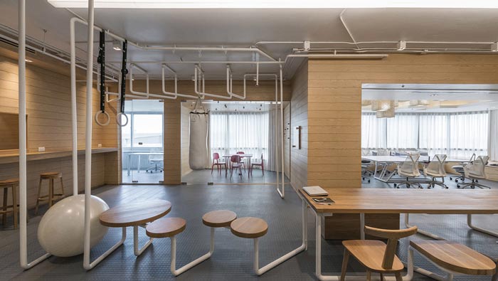 IT公司辦公室單杠區設計:此處主要是員工活動、健身的區域,這也是此次辦公室設計的一大亮點,設計師將健身巧妙的融入空間,當員工勞累的時候,可以來這樣鍛煉一下,一來強身健體,二來打破心中憂郁。