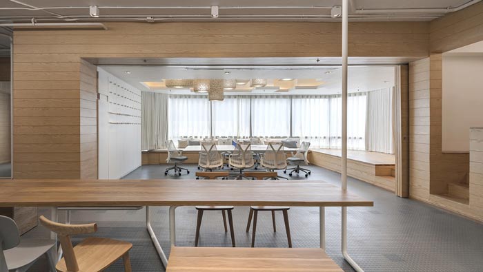 IT公司辦公室會議室設計:推拉門的出現讓空間有了更多可能,在平時推拉門被隱藏起來,不仔細看基本發現不了,當會議開展的時候,推拉門有效的隔絕整個空間,一個小小的門為整個空間扎上了騰飛的翅膀。