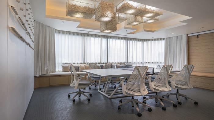 IT公司辦公室會議休息區設計:會議室與休息區域相互融合在一起,表達了設計師勞逸結合的設計理念,問題的解決往往不是一次會議就可以解決的,而有效的休息正是彼此相互交流的最佳時機。