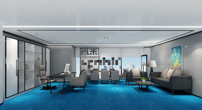 總經理辦公室開敞明亮,落地玻璃窗帶進滿室燦爛的陽光,而在晚上,美麗的城市夜景則可盡收眼底。深棕色的原木桌椅,黑色沙發,灰色地毯,融合了現代簡約主義理念,散發著清新原始美,滿室盈滿濃郁的簡約情調。