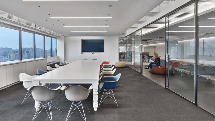 會議室的設(shè)計:設(shè)計師將其安置在空間的一個獨立空間之中,此處與外部采用玻璃隔斷進行分離,以此保證采光的完整性,同時窗簾的設(shè)置也可以保證會議室的私密性,在開展會議的時候可以將外部窗簾拉上,就可以形成一個獨立的空間,空間中沒有一點雜質(zhì),有的只是簡單,讓人的思想在空間中相互交匯。