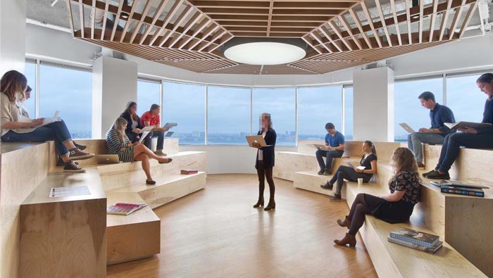 匯報區(qū)域的設(shè)計:此處是一個環(huán)形空間,這樣的空間是一個天然的匯報區(qū)域,因為空間的兩邊可以設(shè)置成類似足球場看臺的層疊式座椅,這樣可以增加空間的容納能力,同時類似三角的設(shè)計自然的向內(nèi)聚集有利于匯報,同時中間區(qū)域被設(shè)計師空置出來,可以留給匯報人,讓匯報更充滿新意。