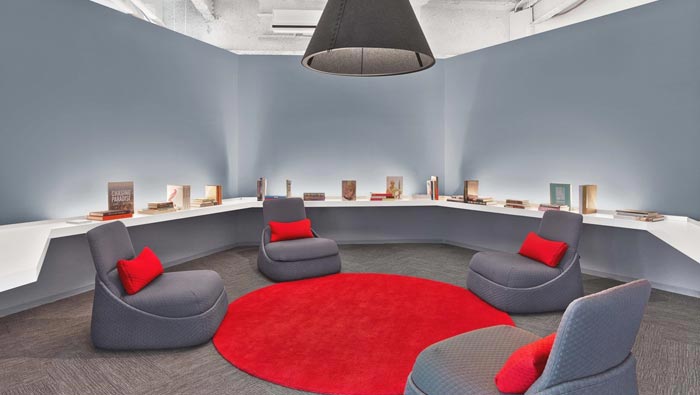 過道的設(shè)計:此處位于辦公區(qū)域的前方,相當(dāng)于是一個過渡區(qū)域,但是設(shè)計師不忍心將此地浪費,故此將此地開發(fā)成學(xué)習(xí)區(qū)域,此地差不多在空間的中心位置上,向前向后都十分方便,而且此處剛好向陽,讓學(xué)習(xí)的員工能在學(xué)習(xí)的過程中,感受到生活的美好。