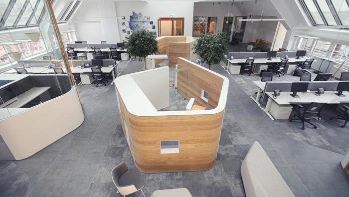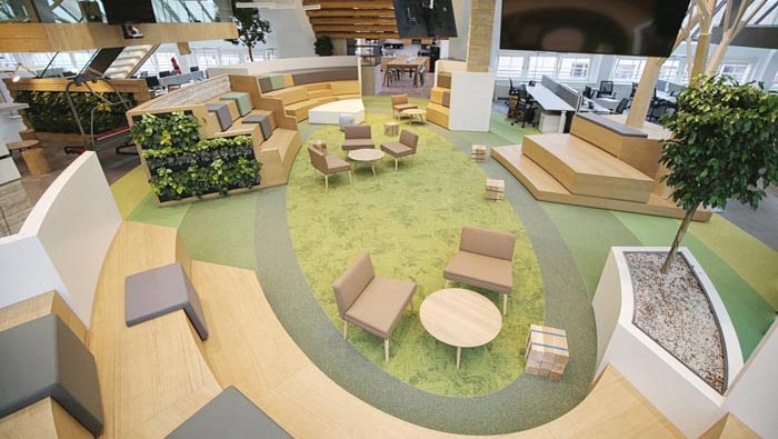 辦公區域的設計:設計師重點在于彌補空間結構對人的影響,因為空間本身是不規則的,這樣很可能讓員工感受到不適,故此設計師在空間的兩邊采用開放式,因為窗呈上下布局這樣很好的將采光加以折射后射入室內,讓光更加溫和、更加溫暖,空間中心采用造型設計為特定部門打造單間式空間,既滿足了企業的需求,又將大空間分為一個個的小空間,讓空間相互彌補、相互搭配。