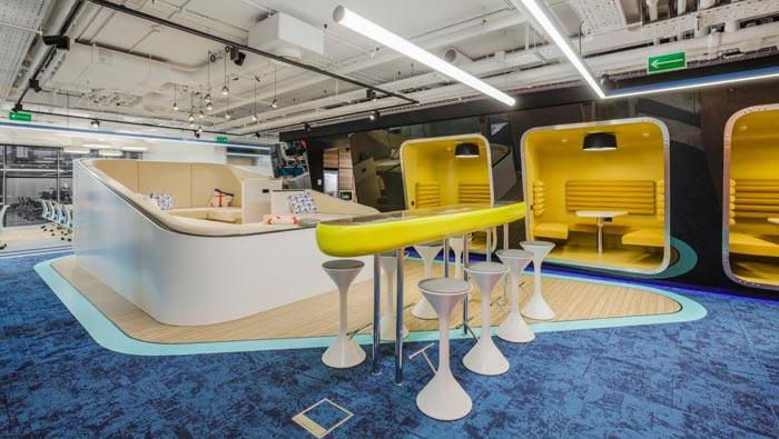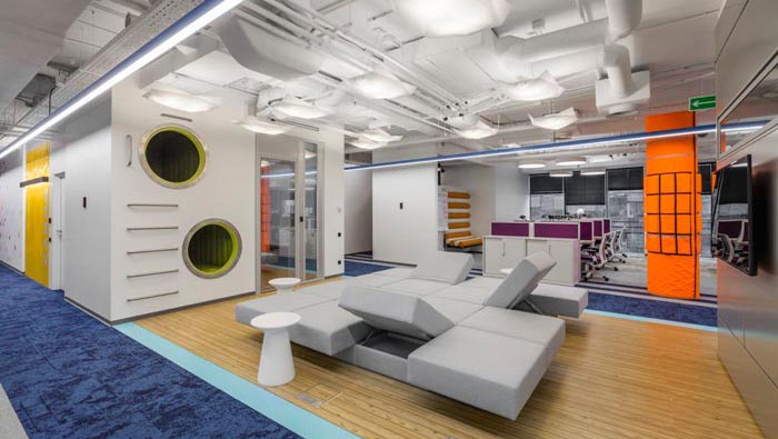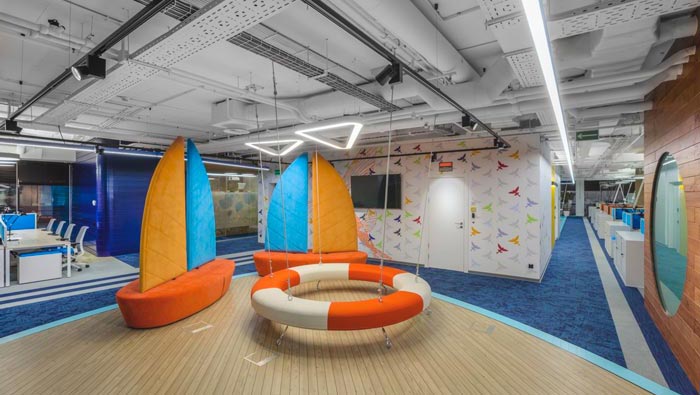 辦公區域的設計:設計師在設計的時候,將辦公區安置在空間的兩側,中間部分主要以洽談、休息為主,同時在辦公區域設置的同時,利用色彩的轉變來區分部門的位置,每一個部門之間都有一定的緩沖地帶,這樣做的目的就是希望在開放的空間內保留員工的私人空間。