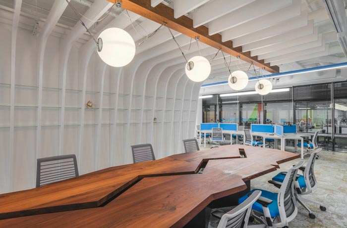 部門會議區域的設計:設計師要推行的就是配套設施的建立,在設計師看來加快辦公的效率就要從基礎做起,沒有基礎的配合一切都是無從談起,故此設計師在設計中,在打造基礎設施布置的同時,也在轉化的方面深思了很多,故此此處既可以當做部門的會議室使用,也可以讓員工在此處辦公、休息、交流,設計師希望將每一個區域的作用發揮到最大。