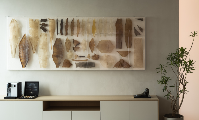 從電梯出來,迎面而來的就是ECCO的前臺,以長虹玻璃與其背后影影綽綽的綠植組成了讓人仿若置身雨林的ECCO Forest。輔以ECCO精神內含的「皮革創新」,為前臺打造了一個特別的皮質接待臺。