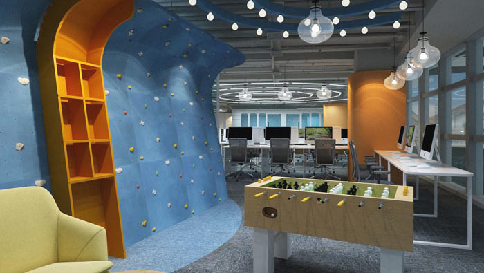 辦公區域的設計:設計師在設計的時候,為了是空間顯得更加搭配,故此設計師在地毯上采用了小小的創意,一個個長方形的圖案在地毯上凸顯,將辦公工位安置在其中,以此與空間其他區域進行有效的區分,同時燈光采用圓形向外擴張的方式,一方面為辦公空間帶來了極好的照明,同時表達自里向外的思維擴張方式。