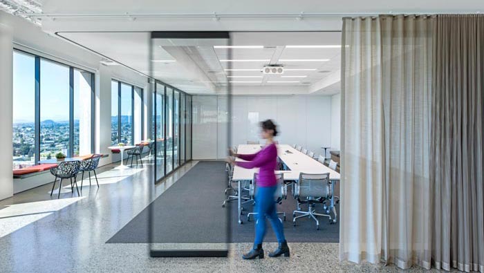 隔斷的設(shè)計:一個完全開放的空間,在設(shè)計師的設(shè)計手法之下,如變戲法一般隔斷從無到有將這個空間包圍起來,以此解決空間過道造成的精力無法集中,同時設(shè)計師采用透明的雙層隔斷,一方面可以不破壞整個空間的意境,另一方面可以保證內(nèi)部空間的絕對安靜。