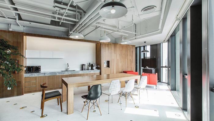 茶水間的設計:設計師在設計的時候,將其安置在空間的一個角落區域,此處呈三角形分布,設計師在設計中將茶水柜安置在空間三角的一條直線上靠墻分布,這樣的好處就是可以為空間留下足夠的使用空間,其中分布有休息桌椅、電視柜、沙發等,這樣可以讓員工在此地得以放松與歸零。