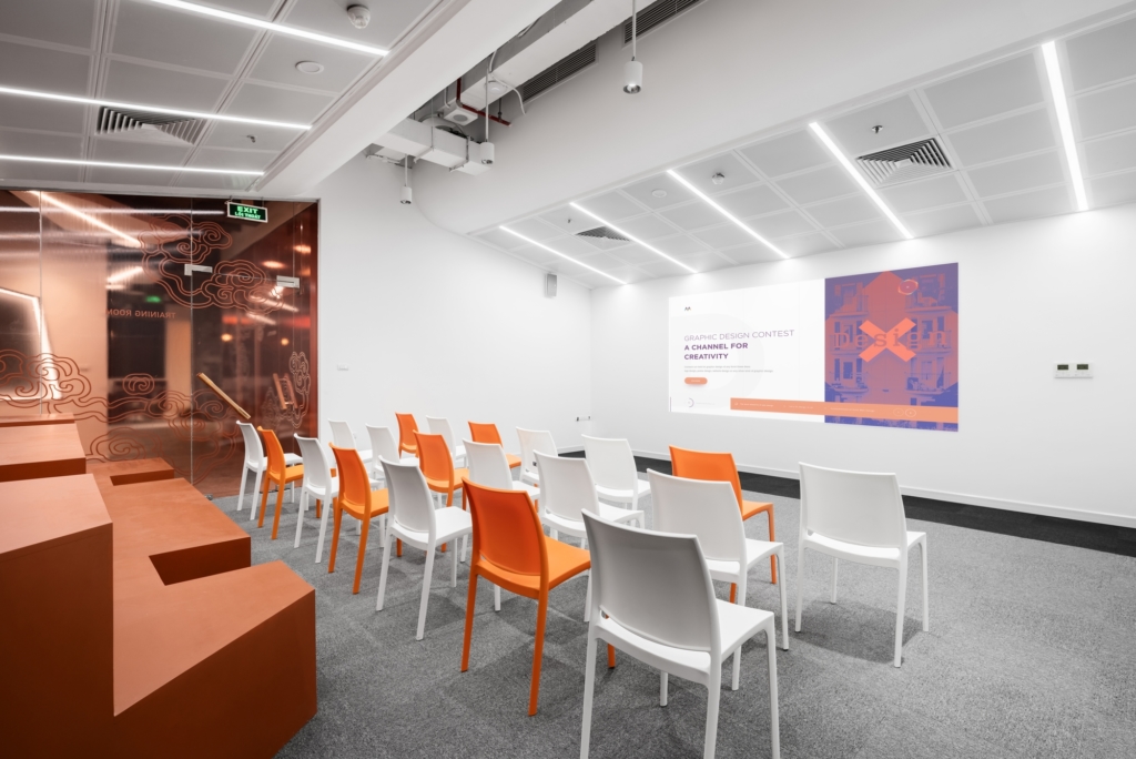 相反,我們保持個人工作空間的開放、干凈和簡單,主要顏色是白色和灰色,沒有墻壁,也沒有私人房間來表達團隊的透明文化。我們為所有的會議室和培訓室使用了帶有品牌色彩標記的玻璃隔板,以保持透明,但仍然足夠私密。最后但并非最不重要的一點是,空間的亮點是用條紋眼鏡設計的透明樹盒,這就造成了樹木內部模糊的效果。這些框也被用來劃分部門,而不是使用標志,使工作空間更有趣。