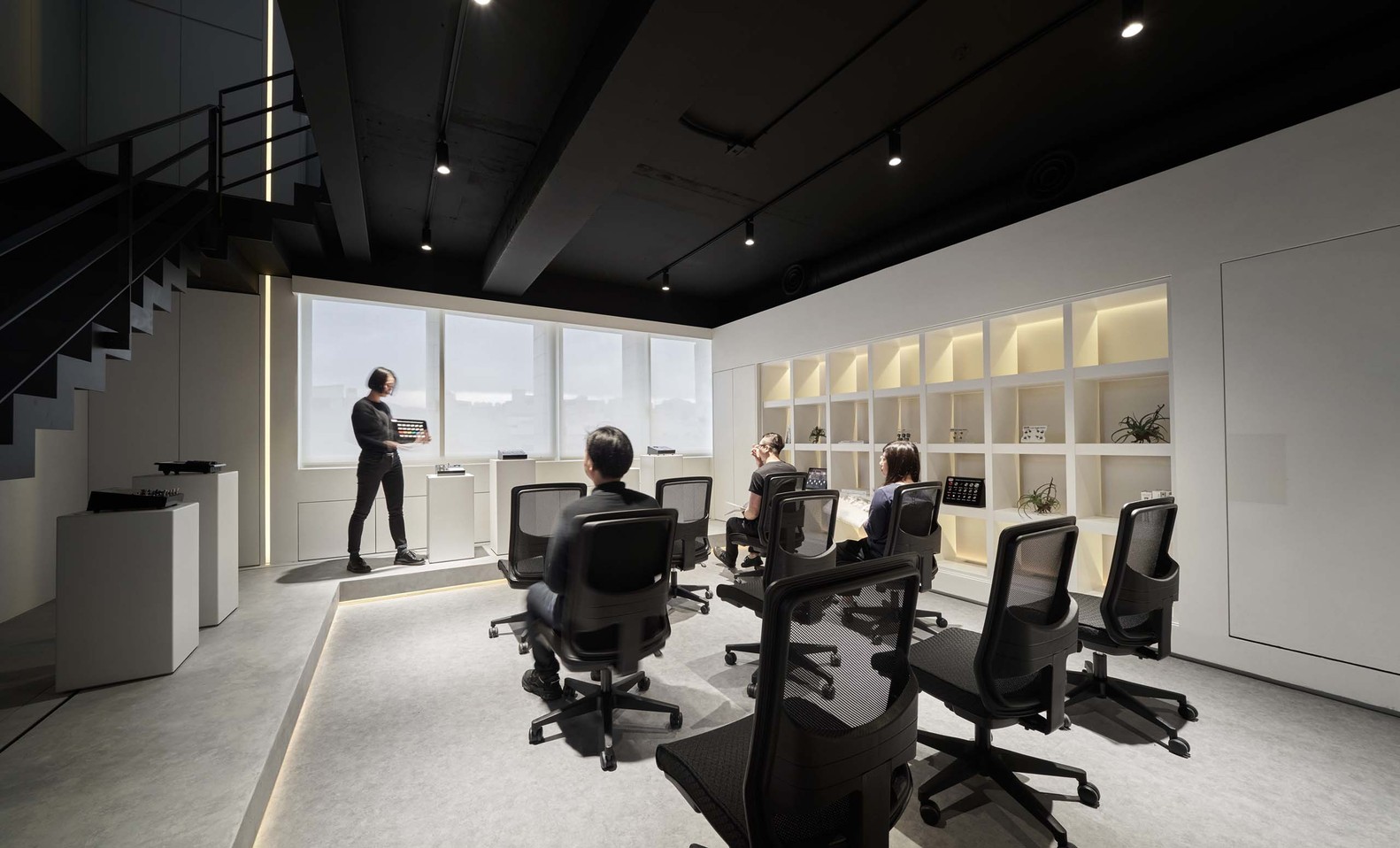 這次帶來一家創意銷售辦公室裝修設計的案例,空間面積218平方米,通過動線規劃將展售行為重新圍塑,利用開放空間里采光的明暗對比,區劃出辦公空間并把會議及展示空間加以融合,借此打破會議和銷售行為之間的藩籬,拉近產品與客戶之間的溝通距離。 會議空間通過開放動線,隱性地引導著銷售流程,同時能提供產品說明以及員工教育訓練的使用可能性,透過場域的留白讓展示保有較多的使用彈性,吸引來訪者有效的聚焦于微型開關產品。