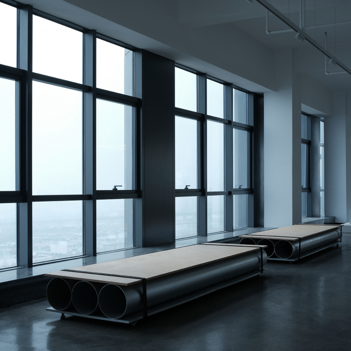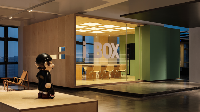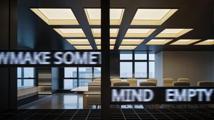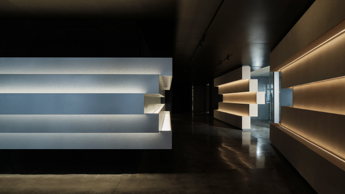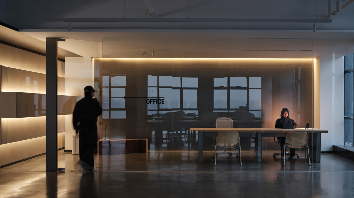 因為項目設于商源大廈的頂層,設計師提出了舍棄”前臺”與”門”的布局,把展廳和部分公共空間提升成為大廈的配套,可供其它樓層和友商們使用,因此釋放了更多可利用的空間,讓來賓無意識地便進入至甲古文的總部之中。