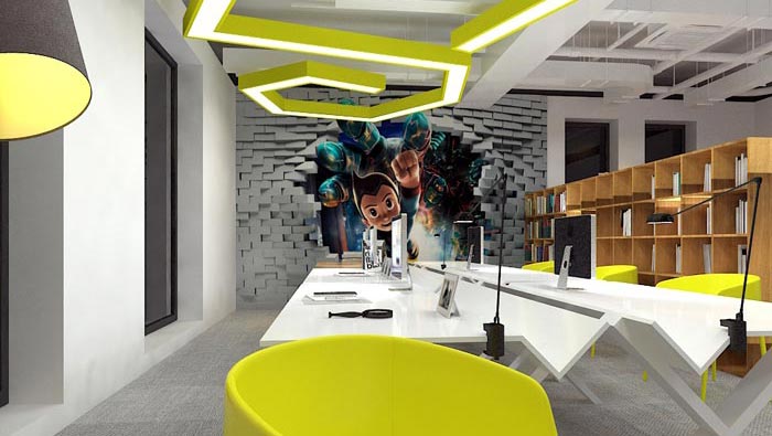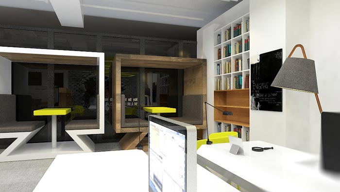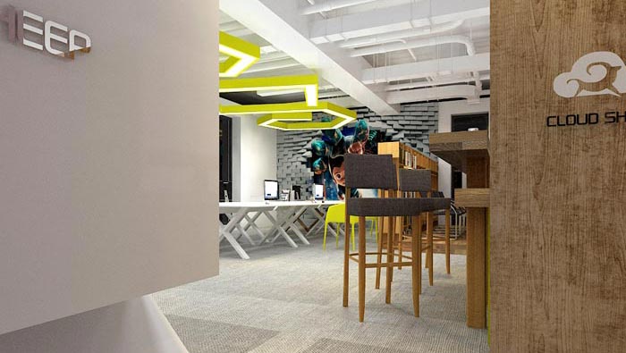 工作室設(shè)計(jì):進(jìn)門區(qū)域的設(shè)計(jì),設(shè)計(jì)師在設(shè)計(jì)的時(shí)候,利用夾角對前臺進(jìn)行設(shè)計(jì),夾角一來可以使客戶看到空間的一個(gè)大致狀況,讓客戶對內(nèi)部空間充滿好奇,二來夾角利用企業(yè)品牌的展現(xiàn),夾角本身的特性決定360度在此處無法展開,這樣也使企業(yè)品牌在此處可以全方位得以展示。