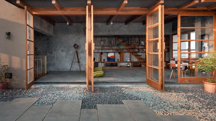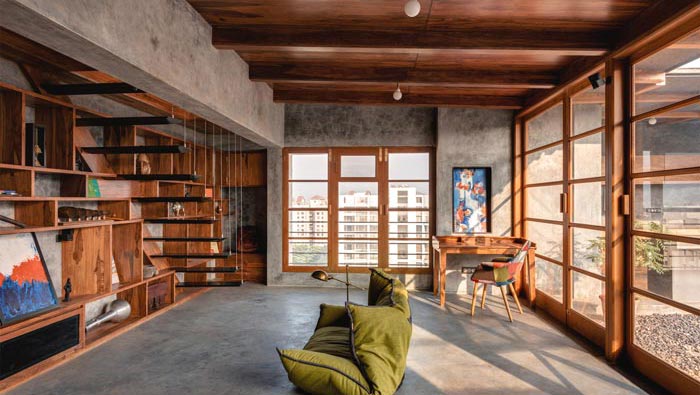 大門(mén)的設(shè)計(jì):此處位于頂層的復(fù)式空間之內(nèi),空間共兩層外加一個(gè)陽(yáng)臺(tái),在門(mén)的設(shè)計(jì)上設(shè)計(jì)師采用傳統(tǒng)木門(mén)為空間打造了3扇大門(mén),門(mén)的寬度幾乎與室內(nèi)空間一致,這樣做的目的就是盡可能的擴(kuò)大空間的視覺(jué)效果,讓室內(nèi)空間與室外空間形成一個(gè)有效的互動(dòng)。