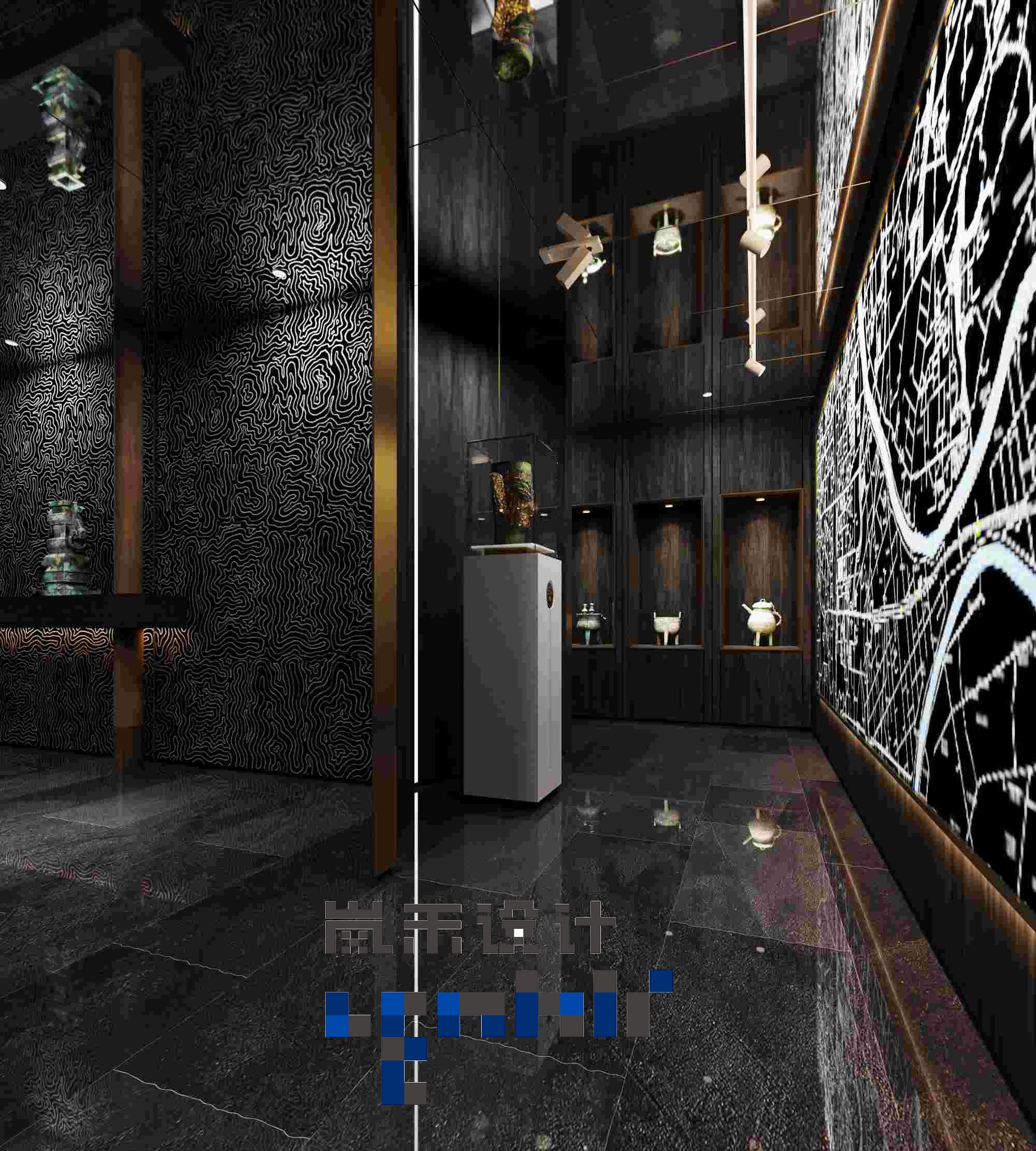 在設計初期洽談時,得知了甲方公司的中心思想與理念,即神秘,沉重,尊貴為空間的核心元素,隨著而擴張開來,設計師在選用展廳配色搭配的時候選擇了黑金,自古以來黑金就是權利和神秘的象征,早在秦始皇時期就奠定了黑金的顏色象征。