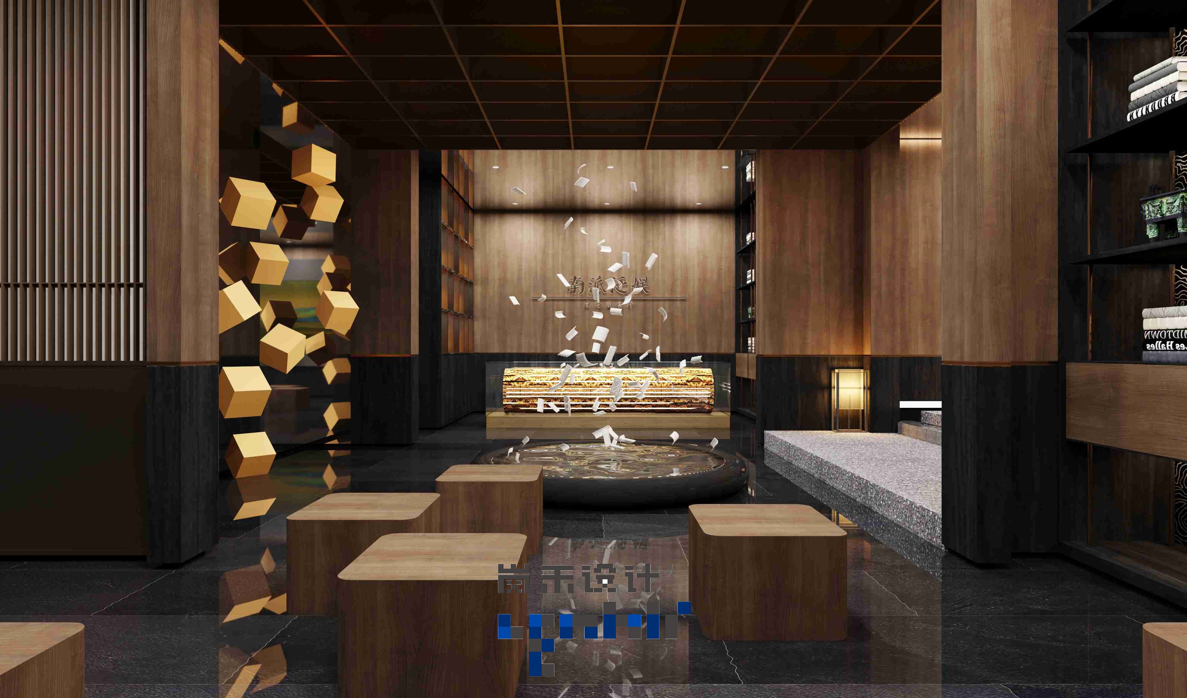 大廳意味著一個建筑的主題,整體色為黑金,兩面的隔斷呈屏風對稱斜狀,似乎是大門半開的快快請進的意思,采用了中國古典元素,而背景墻采用了錯綜復雜的紋理,使人進門就眼前一亮。