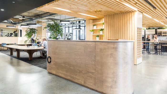 節能公司辦公室前臺設計:前臺位于整個辦公空間的中心區域,這樣設計的好處就是為空間同時增添了多條進出口,設計師這樣做的目的,就是要打破空間之間的界限,讓辦公更加自由。