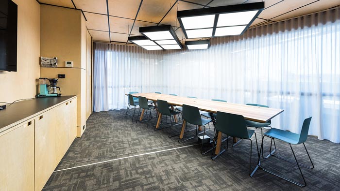 節能公司辦公室會議室設計:整個空間是個類似于梯形的空間,空間的一面全部都是落地窗,在這里完全可以俯視城市美麗的景色,這也正是設計師為會議額外準備的,讓大家煩躁的心重新安靜下來。
