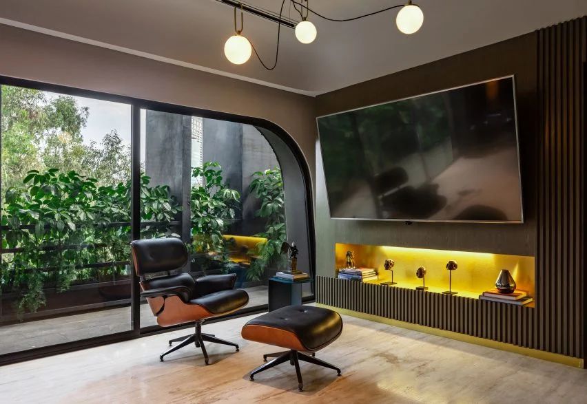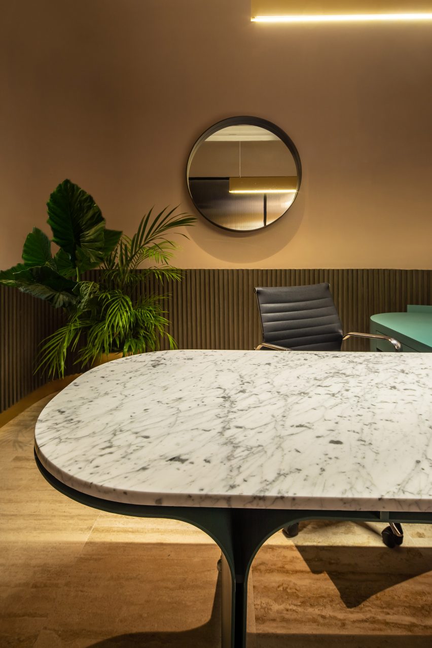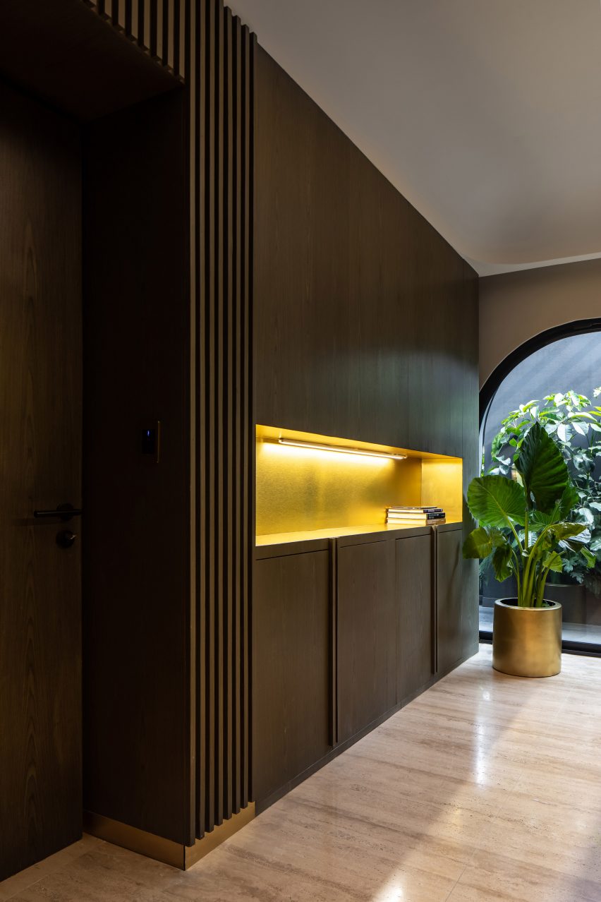 在這里使用了較輕的飾面,包括淺色的大理石書桌,以及更多的金色口音和大量植物。工作室承擔了建筑的范圍,也設計了家具。照明獲得了舒適和家庭的感覺,以環境為導向,但在需要的地方非常準時,形成了鮮明的對比和陰影,因為材質的巧妙選擇和視覺效果可以用它的紋理來實現。