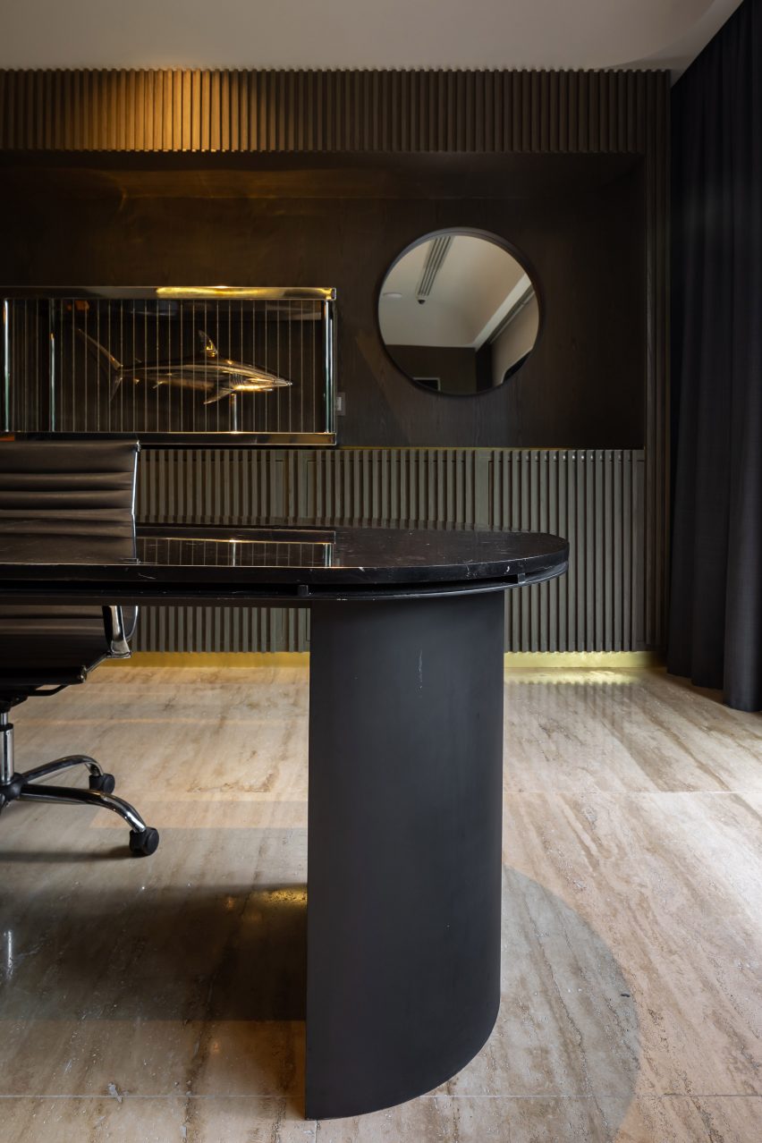 深色的表面與閃亮的金色口音形成鮮明對比。黑暗的木質隔板排列在導演的套房和會議室的墻壁上,與貫穿整個空間的輕大理石地板形成鮮明對比。