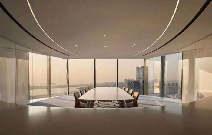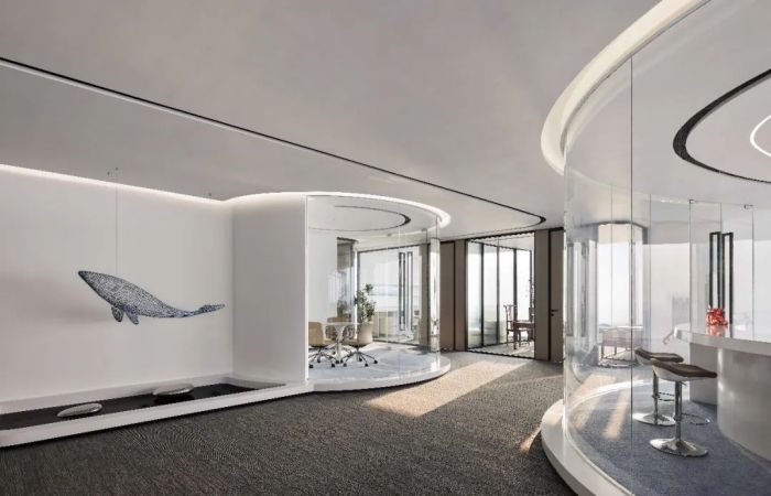 設(shè)計(jì)風(fēng)格采用大而平順的弧度和圓潤(rùn)的造型,注入了柔性力量。空間中充滿海洋文化的氣息,懸吊的鯨魚(yú)藝術(shù)裝置成為空間的導(dǎo)言,歡迎人們深入其中。員工區(qū)呈現(xiàn)開(kāi)放交流的狀態(tài),便于員工間的密切合作。整體的空間型態(tài),如展翅的鯤鵬翱翔于大海之畔。